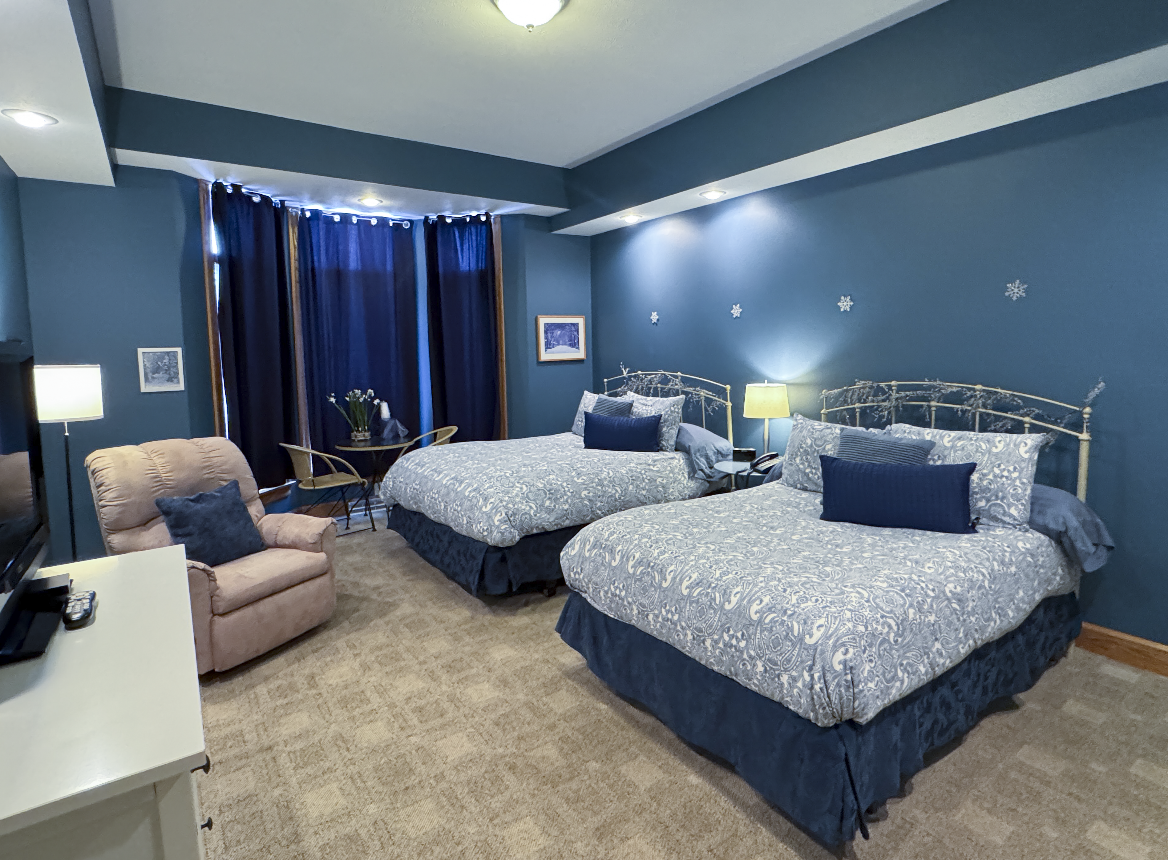 This spacious first-floor room includes one king bed, one queen bed, and a kitchenette. Ideal for extended stays or guests needing extra space.