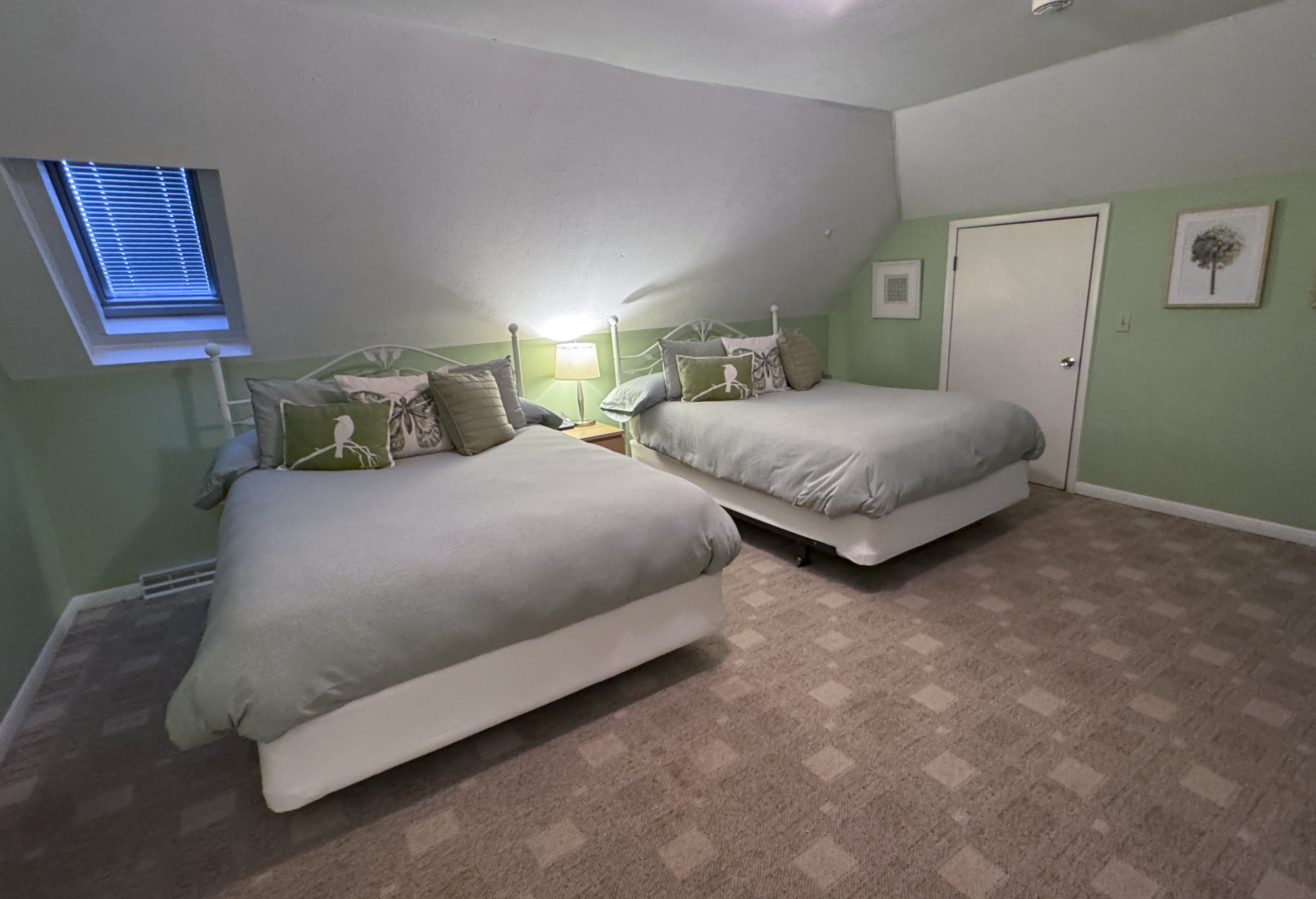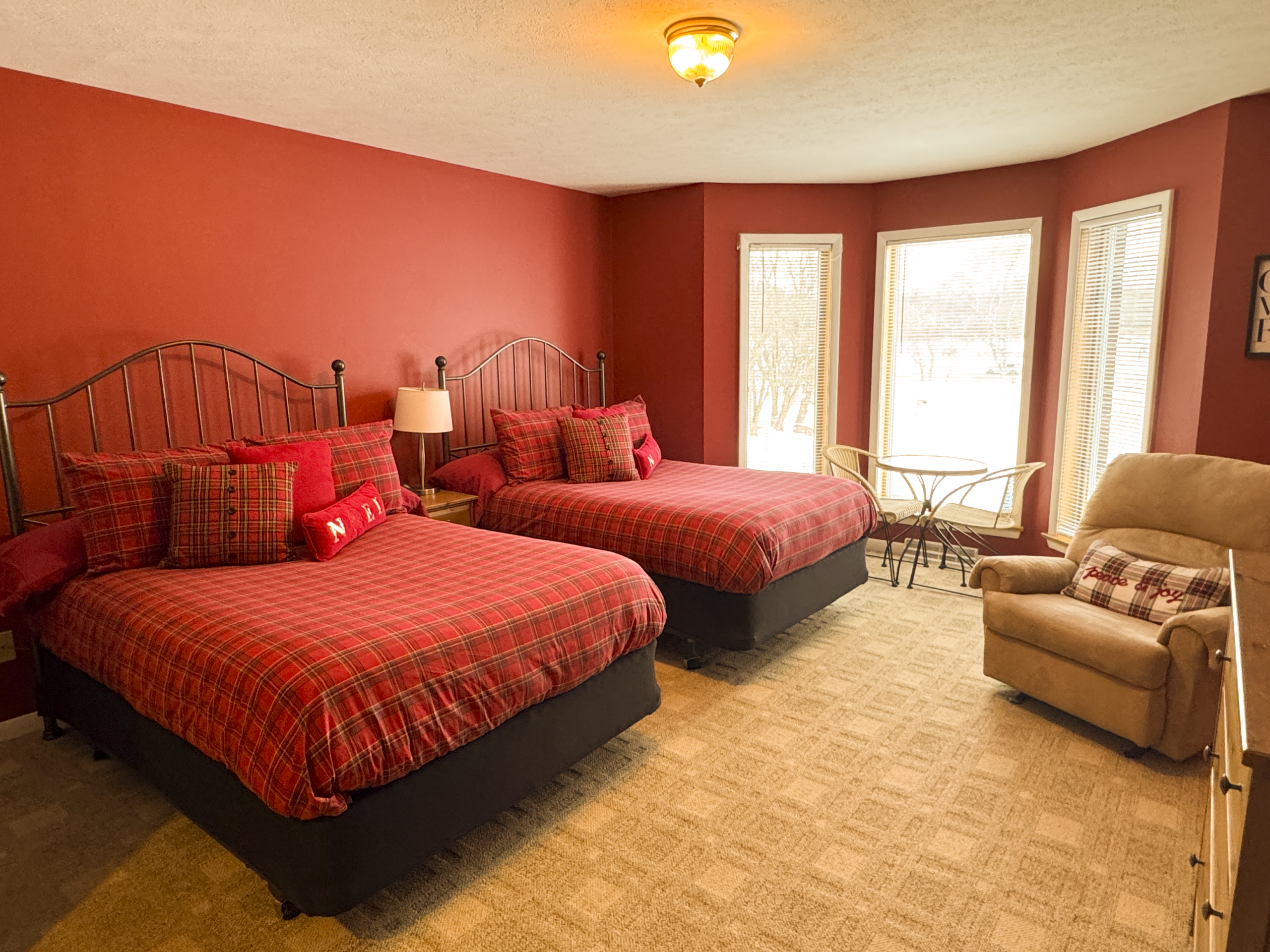 This second-floor room features two queen beds and a bright, open layout. Well suited for families or groups seeking comfort and space.