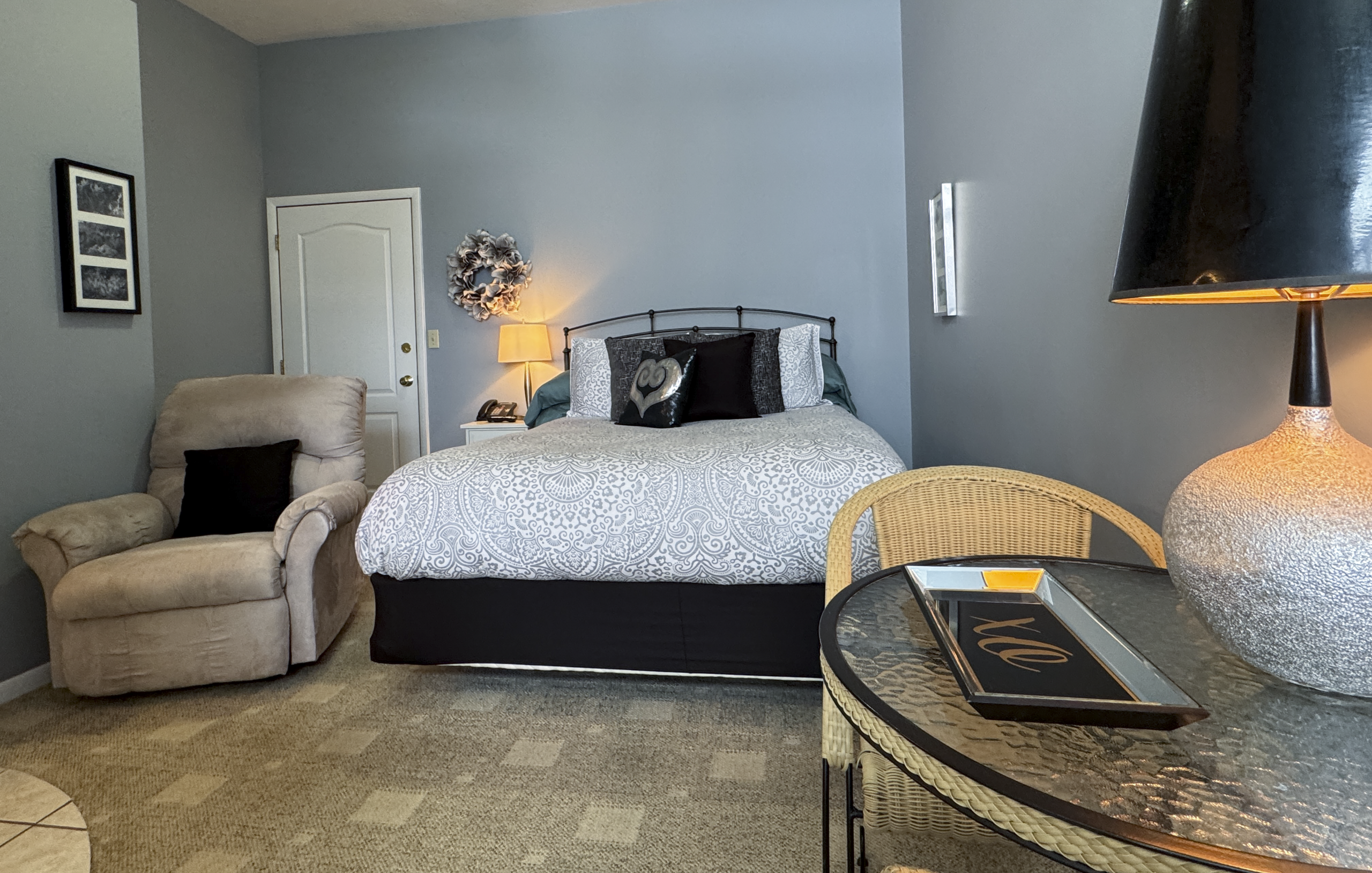 This first-floor room features a queen bed and a private Jacuzzi for added comfort. Perfect for a cozy, romantic getaway.